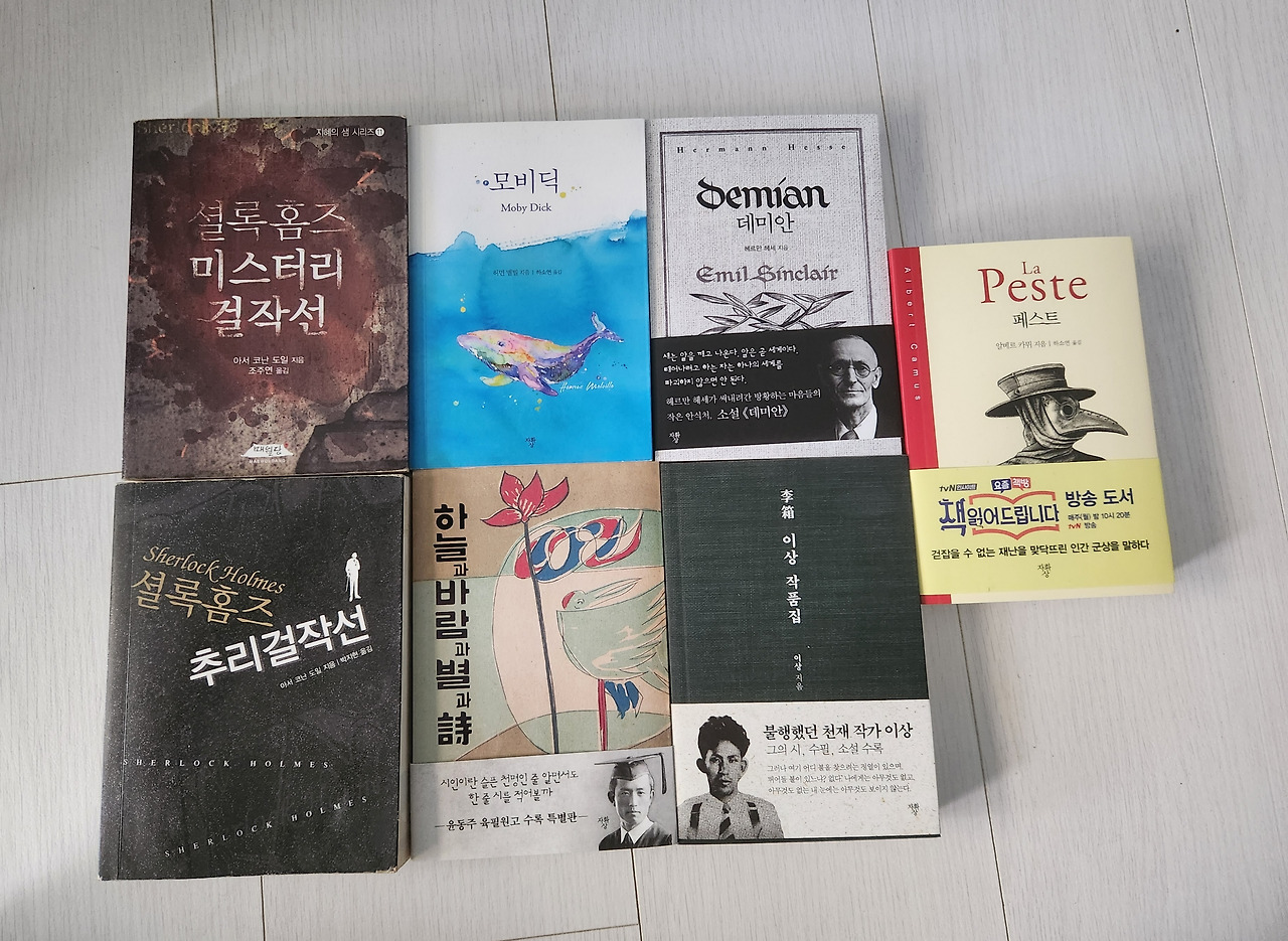 지금은 이상 작품집을 읽고 있고, 얼마 전에 모비딕을 다 읽었다. 셜록홈즈는 그 전에 두 시리즈 모두 읽었다. 페스트도 읽었지만 일곱 권을 모두 다 읽고 한 번 더 읽으려고 기다리는 중이다.