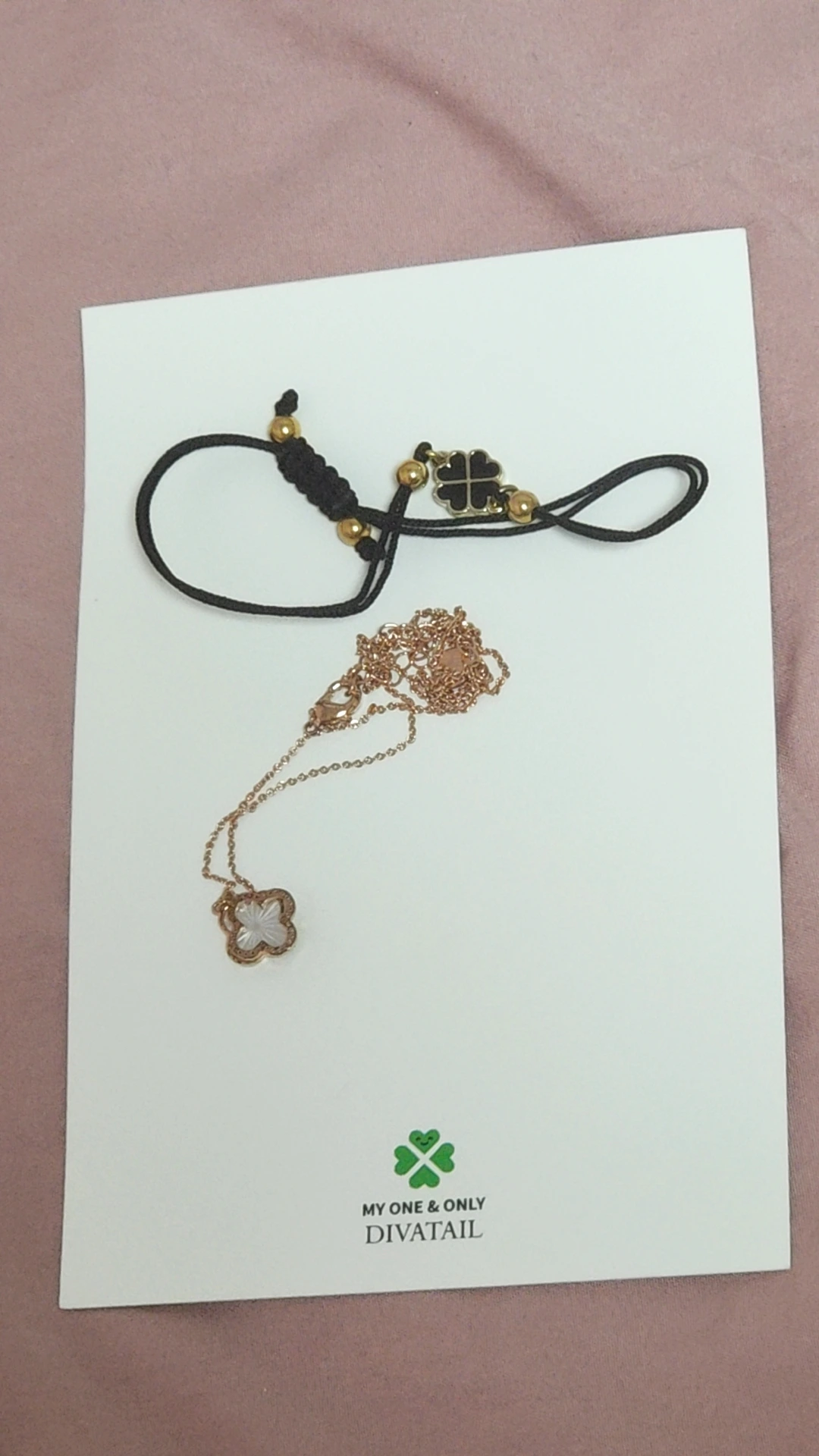 팔찌와 팔찌를 샀을 때 같이 온 엽서, 목걸이까지 네 잎 클로버다. 행운이 오지 않더라도 예쁘고 기분은 좋다.