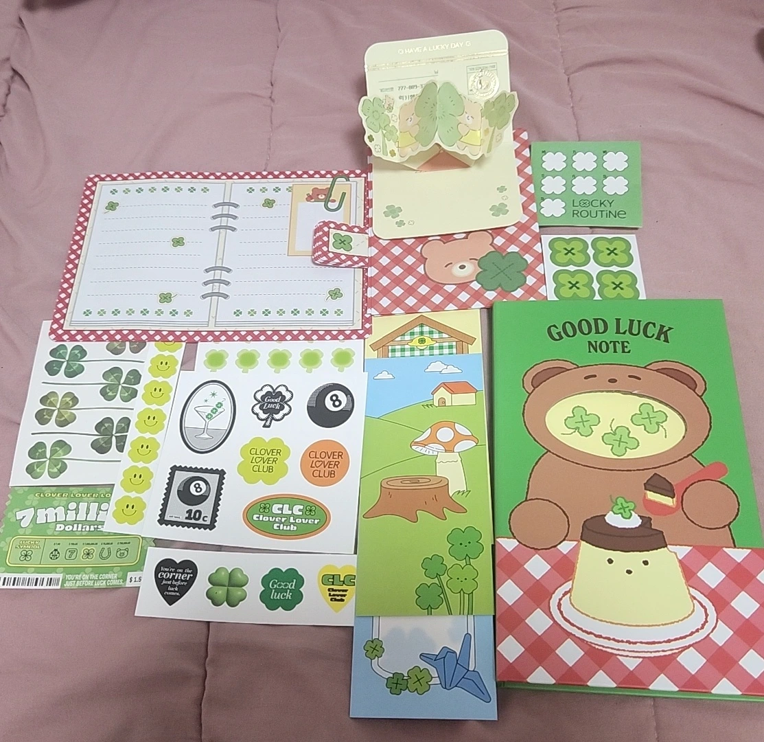 네 잎 클로버가 좋아서 하나씩 모아본 문구류와 액세서리다. 다이어리 모양의 편지지와 행운 통장, 네 잎 클로버가 가득한 스티커, 책갈피, 노트까지 종류는 다양했고, 다이소에서 하나씩 사 모은 것들이다.