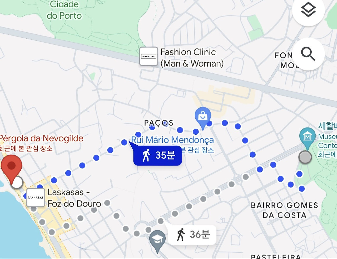 Museu de Arte Contemporanea de Serralves(세랄베스 현대미술관)에서 다시 Pergola da Foz(페르골라 다 포즈)까지 35분 정도 더 걸었다. 오피스 건물들이 즐비하던 거리를 벗어나 가정집들이 즐비한 조용한 거리로 접어들었다. 1시간 이상을 걷고 있는 중이었기 때문에 땀이 흐르는 와중이었는데 멋지게 늘어선 가로수 길이 보이고 가로수가 만들어낸 그늘에서 시원한 바람이 불고 있어서 더없이 좋았던 길이었다.