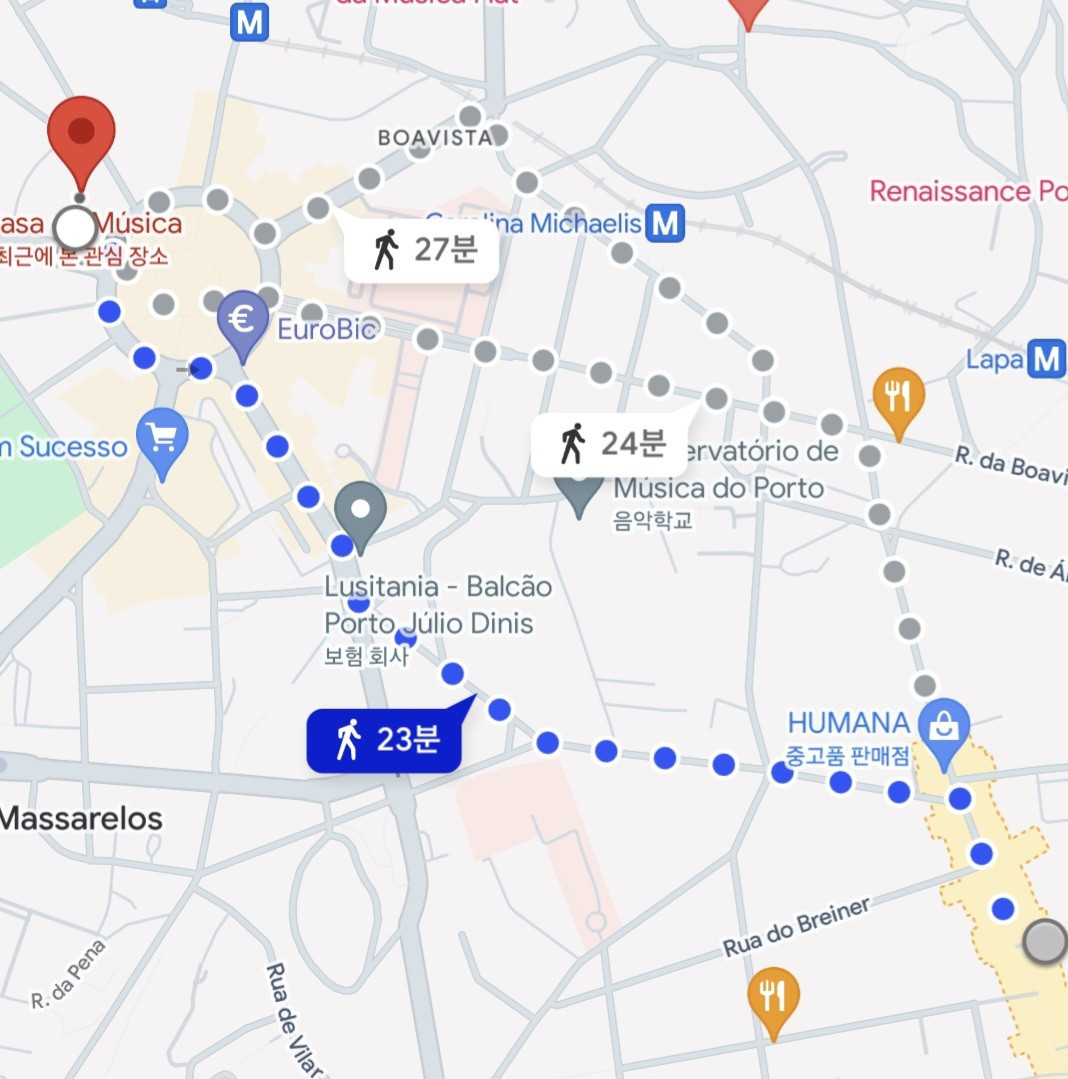 숙소에서 Casa da Musica 까지는 도보 23분 정도라고 구글지도가 알려준다. 지금까지 가 보지 않은 길이었기에 흥미롭게 출발을 했다. 오피스 건물들이 즐비한 거리였다. 땀이 나긴 했지만 시원한 바람이 불고 있어서 체감상 많이 더운 날씨는 아니었다.