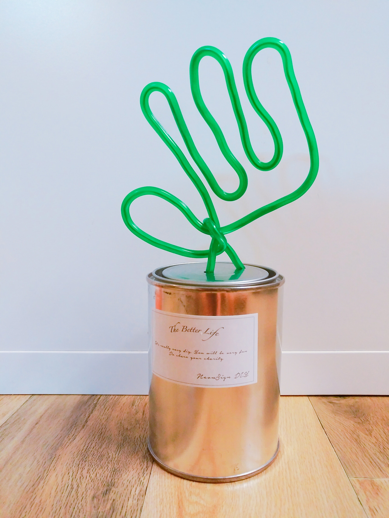 야자수가 큰 나뭇잎으로 나뭇잎에서 삼각 트리로 점점 곡선의 간소화가 진행되다가 여러차례 조물딱거린 네온바의 시작점이 되는 캔뚜껑쪽 구멍이 헐거워져서 쓰러지지 않기 위해 안간힘을 쓴 모양으로 마무리 지었다.
