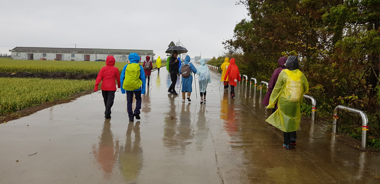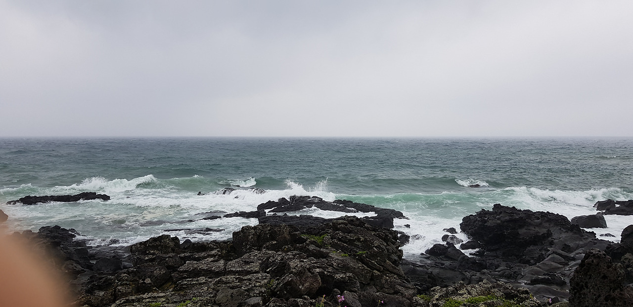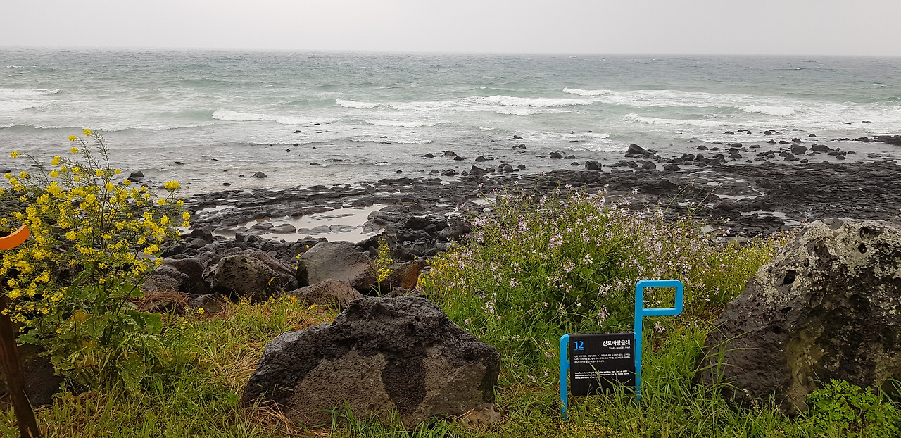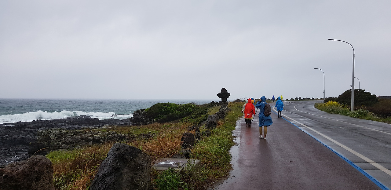 12코스의 시작점이 가까워오면서 버스 창문을 세차게 두드리며 비가 내리고 있었다.