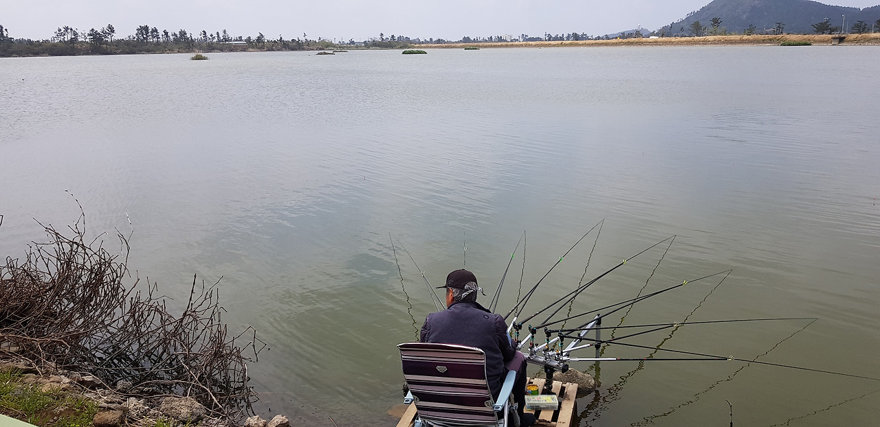 용수 저수지에서 낚시하는 아저씨의 뒷모습과 여러대의 낚시대를 걸쳐 놓은 모습이 인상적이었다.