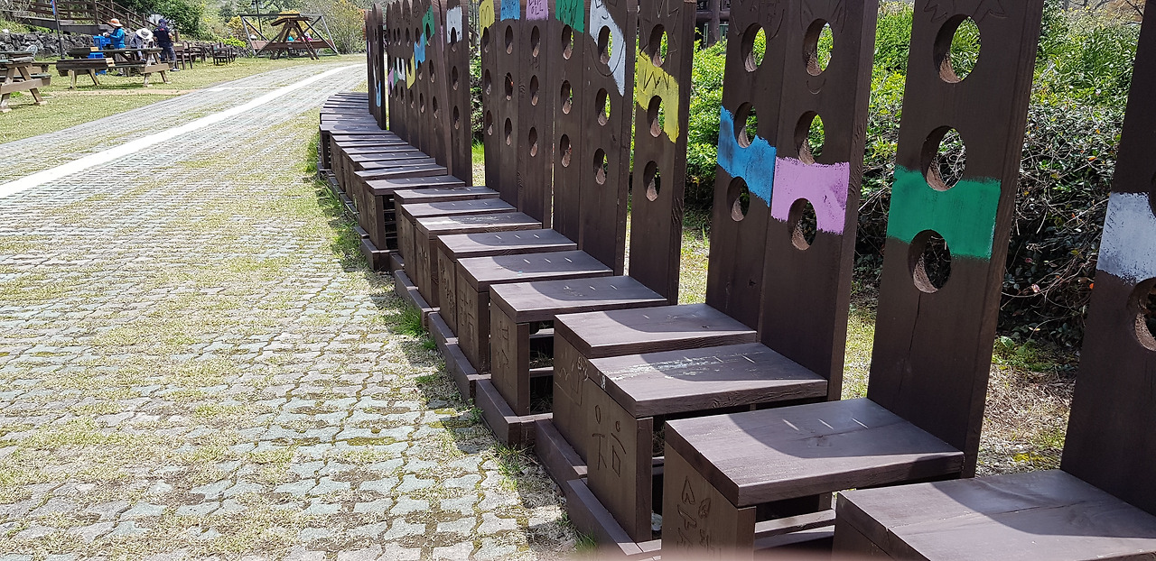 중간 스템프가 있는 아홉굿 의자마을은 수십개의 다양한 의자가 놓여 있었다.