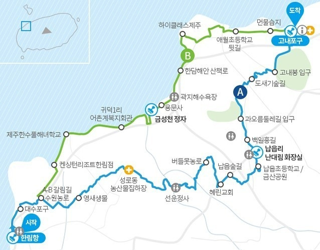 15코스는 A코스와 B코스로 나뉘어져 있는데 A코스는 난대림 숲과 중산간 풍경을 볼 수 있고 B코스는 곽지 애월해안 절경을 볼 수 있는 길이다.