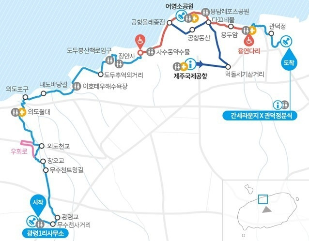 서핑을 하고, 분위기좋은 카페에서 해변을 바라보며 수다를 떨거나, 독특한펍에 가서 수제맥주를 마시고 동문시장에서 다양한 제주 특산물, 공산품을 쇼핑하면 좋을 코스를 걸었다.