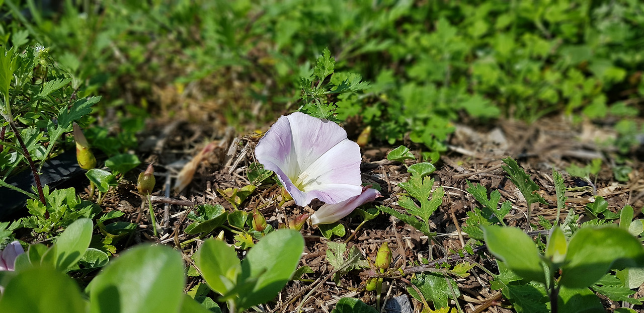 해안 돌담을 보면서, 나팔꽃들이 위로 올라가지 못하고 땅에 피어 있었다.