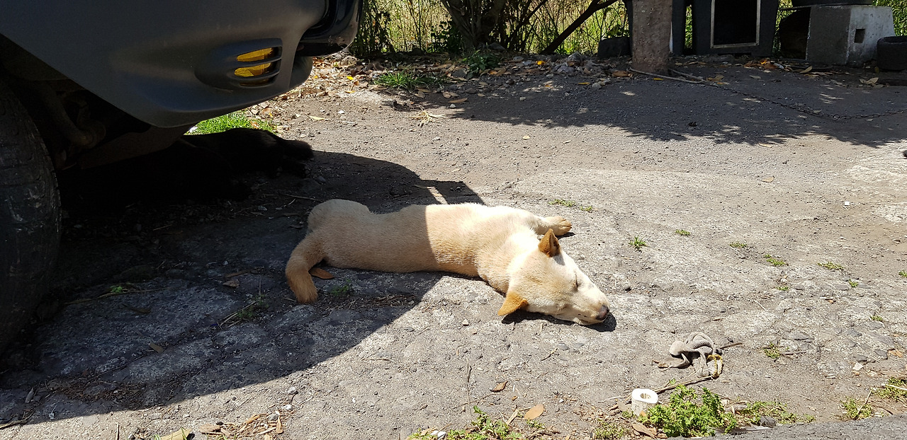 따끈한 도로에 몸을 지지는 흰둥이와, 마치 흰둥이의 휴식을 지켜주려는 듯한 검둥이를 보았고