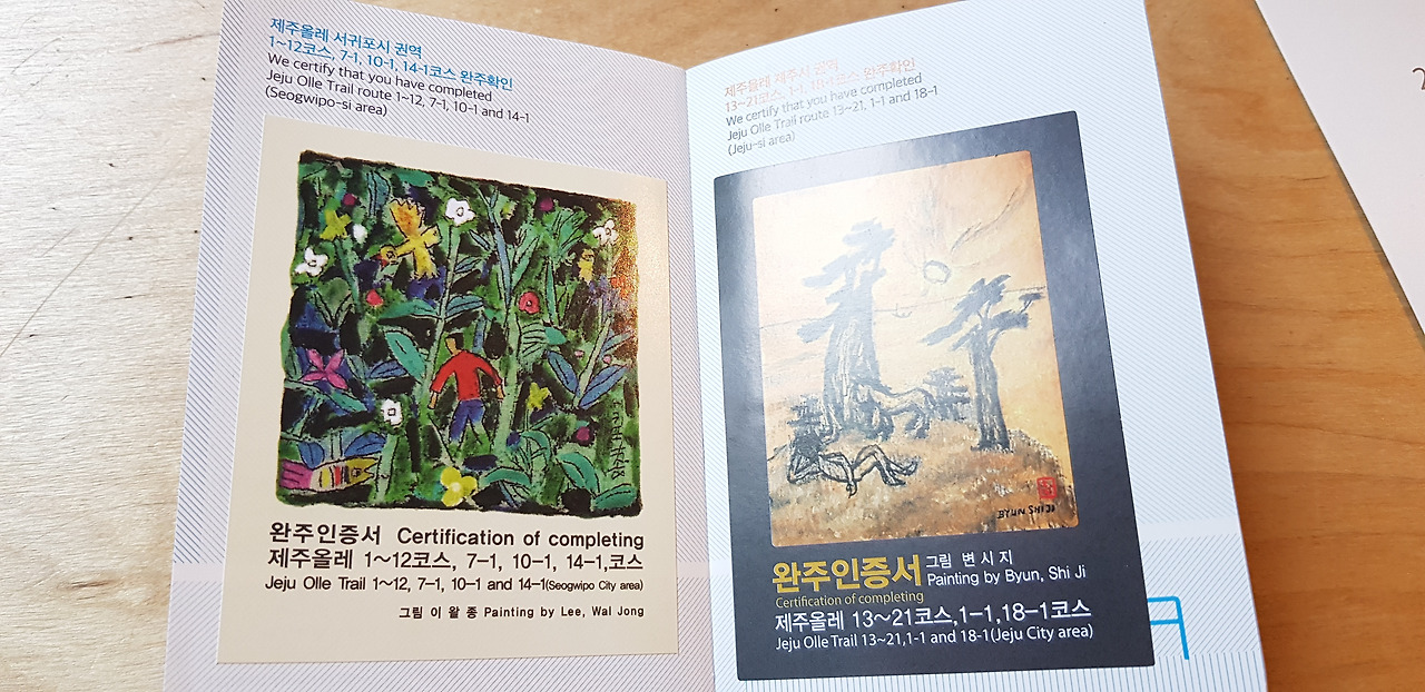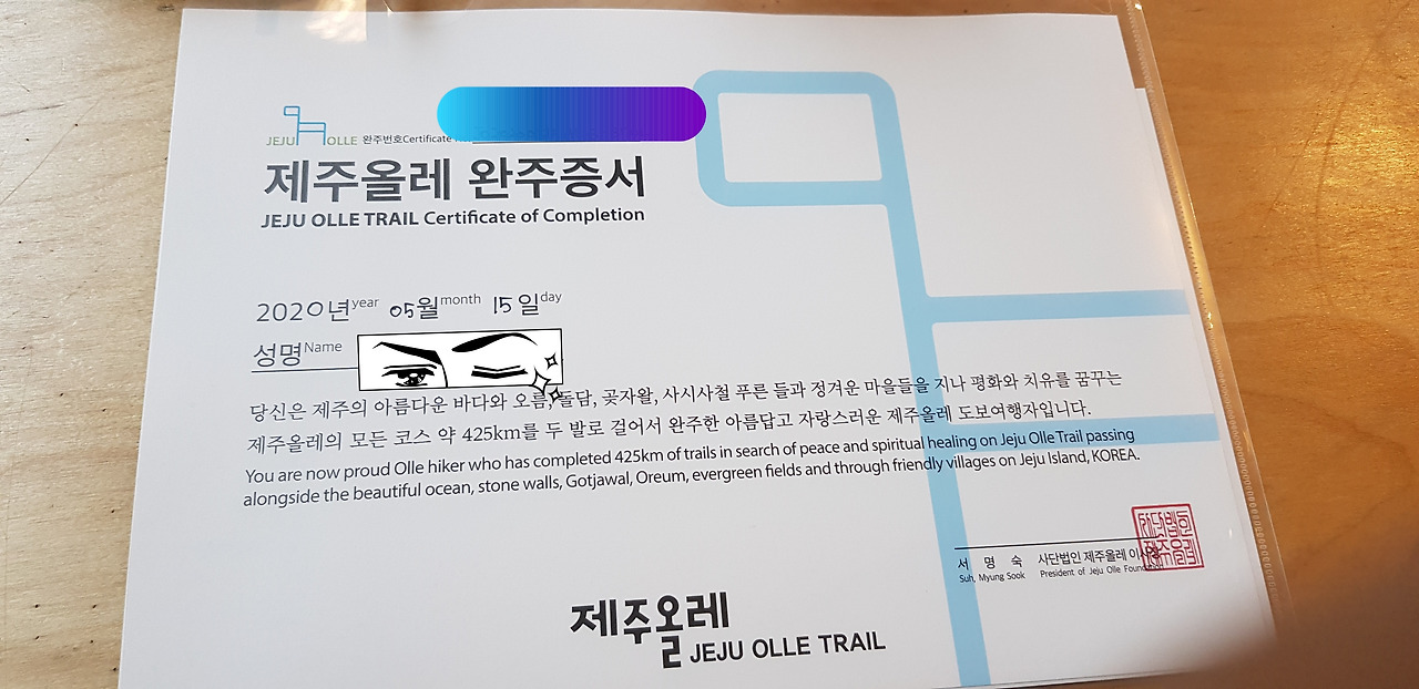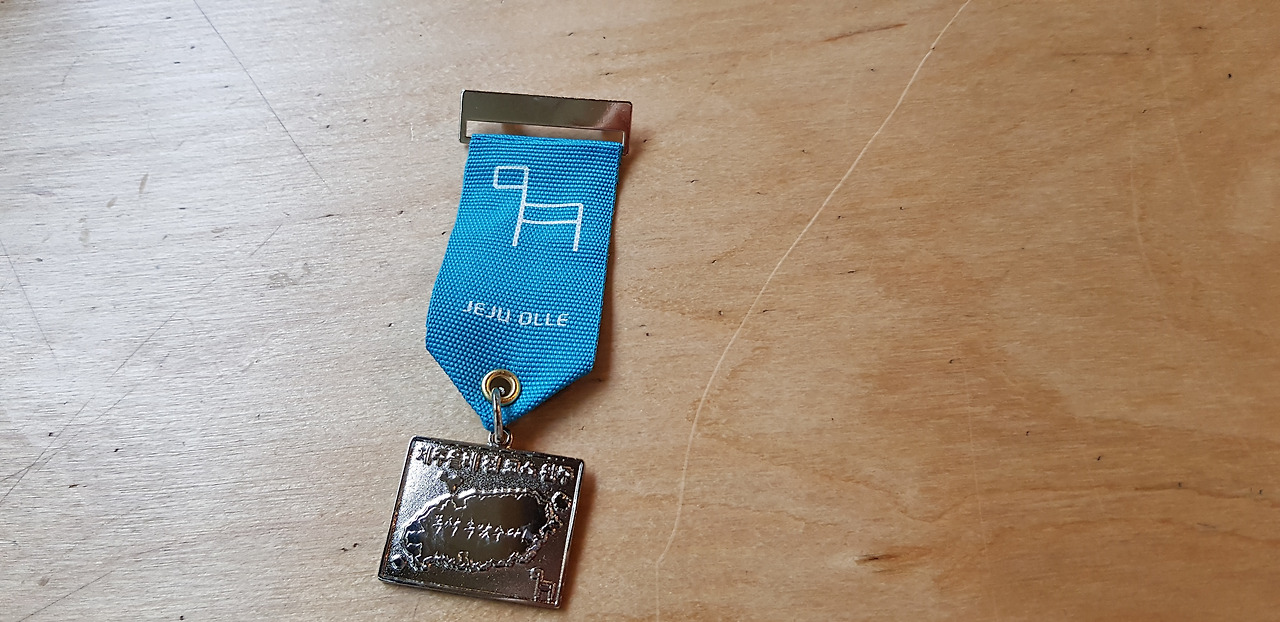 그동안 스템프를 찍었던 올레 패스포드를 전달해드렸고, 스템프가 제대로 찍혔는지 검사후, 완주 증서와 메달을 받을 수 있었다