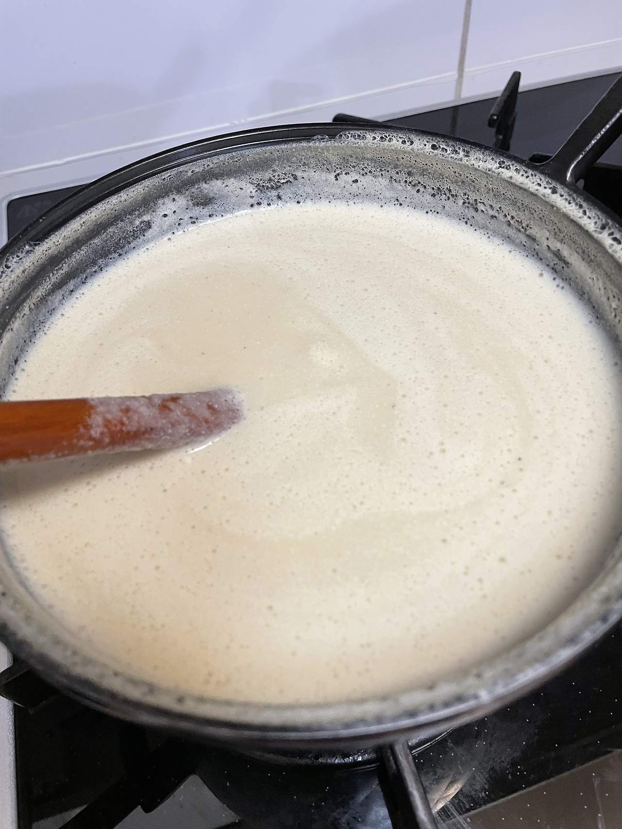 7. 냄비에 갈아낸 감자수프를 옮겨 붓고 약한 불로 뭉근하게 끓여낸다. 이때 우유를 추가해 가며 감자수프의 농도를 조절한다.