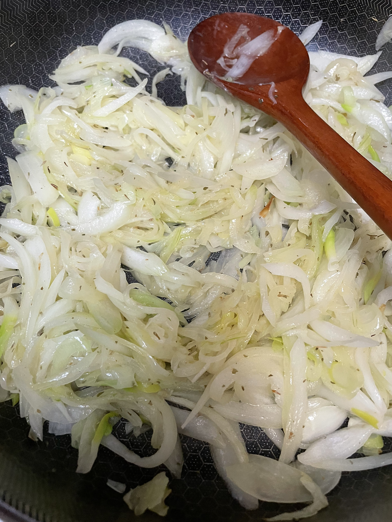 4. 감자를 담가놨던 물은 버리고 감자를 양파 볶던 웍에 넣어 같이 익힌다. 소금, 후추로 간을 해준다.