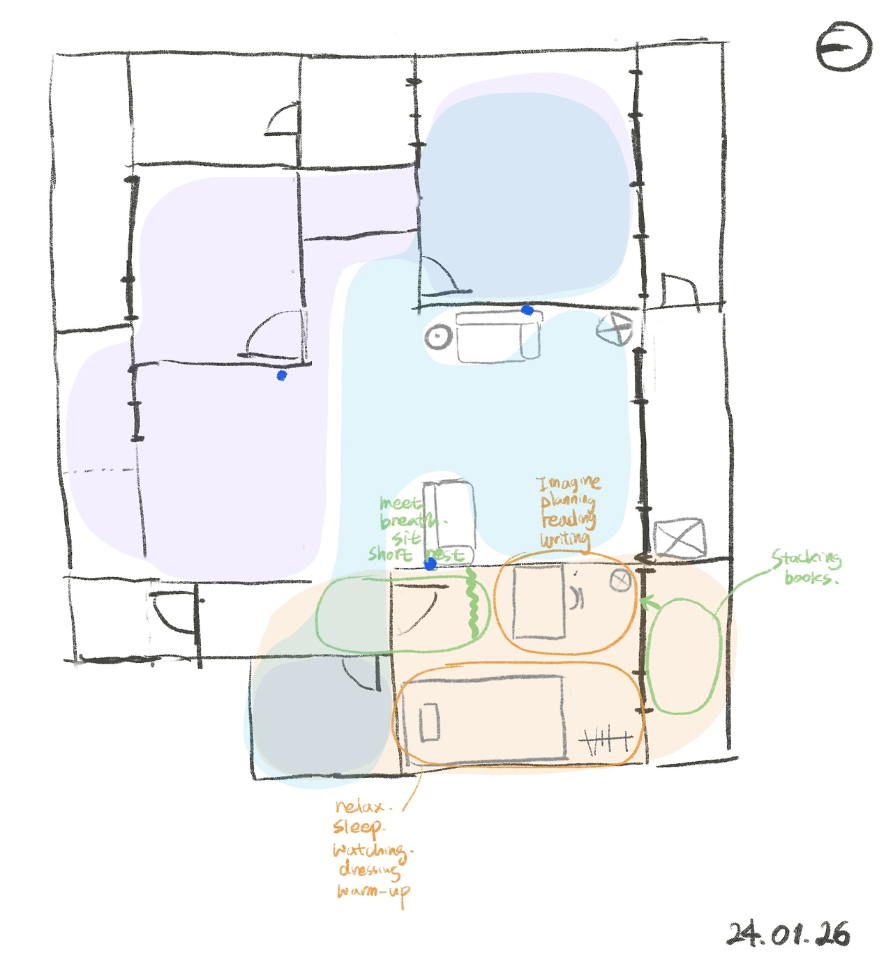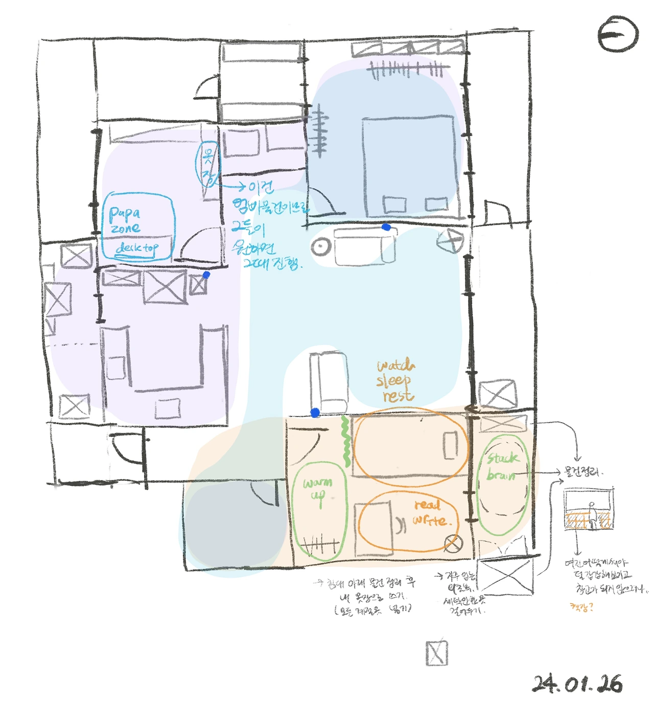 우선 하늘색은 쭈니 님, 보라색은 금짱 님, 주황색은 ‘나‘ 의 영역이다. 참고로 쭈니 님과 금짱 님은 부부다. 개인이 집에서 가장 오래, 자주 머물며 활동이 있는 곳을 표시한 것이다. 아래는 그들의 조건이다.