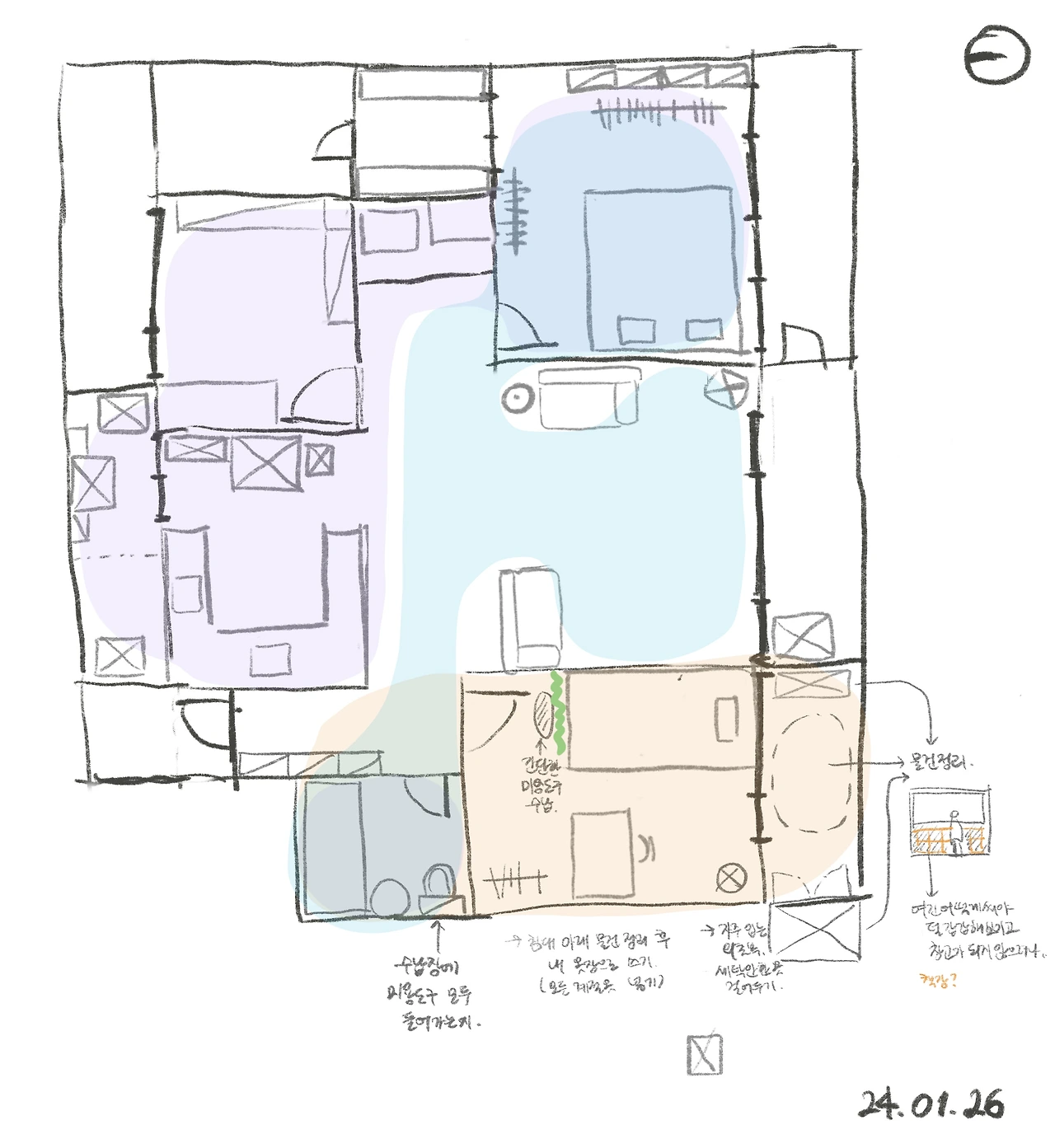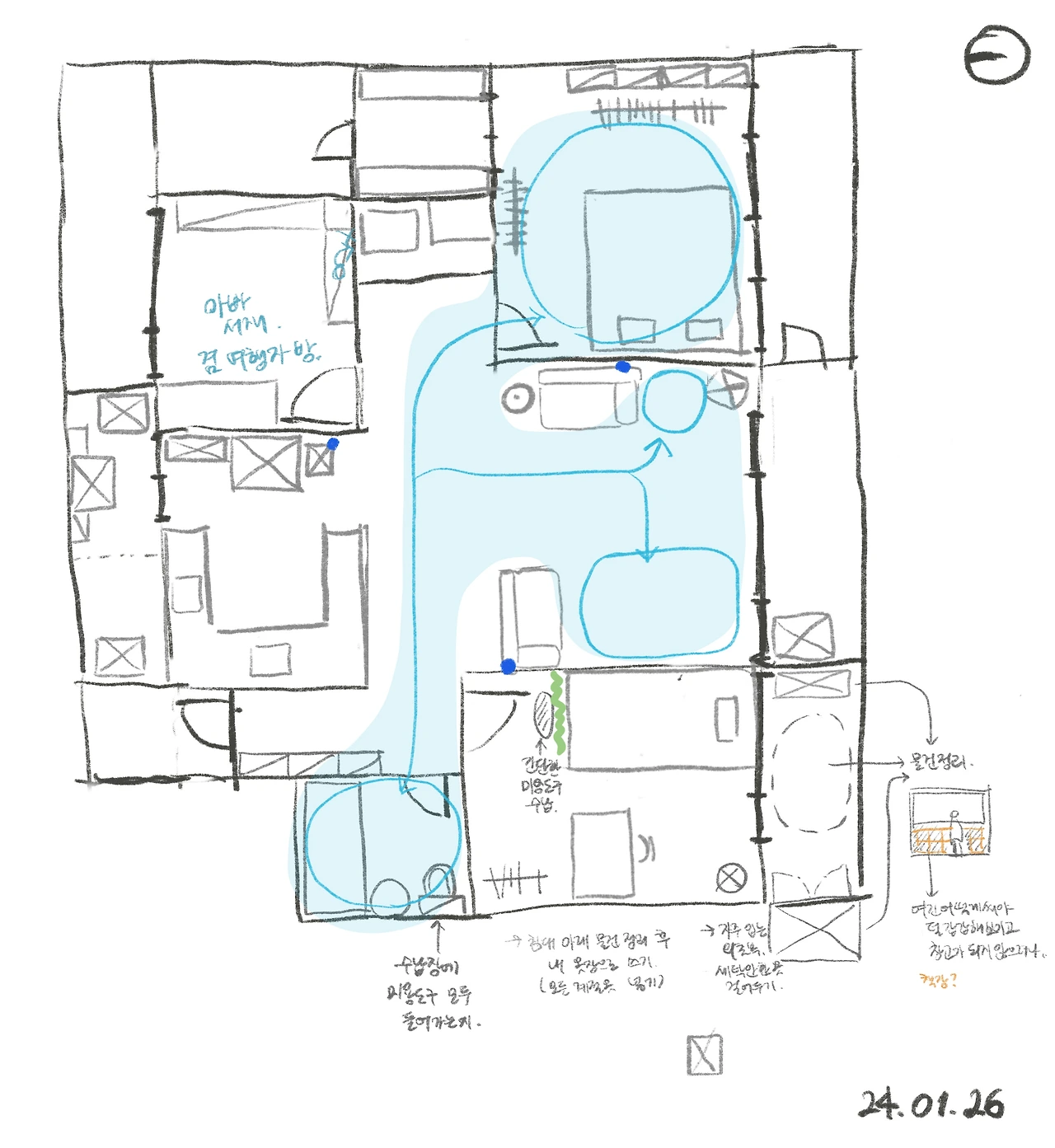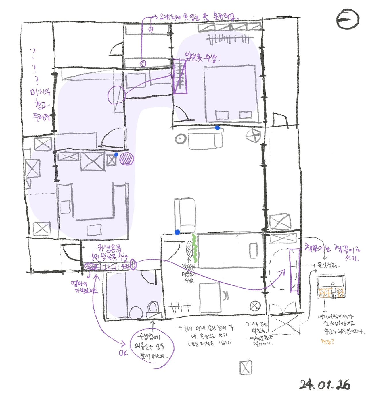 일단 우리 집에 쌓인 짐이 어마어마해서.. (물론 정리한다고 해왔지만 살다 보면 물건이 쌓인다.) 먼저 물건을 분류하는 작업부터 해야 할 듯싶다. 그다음에 먼지를 닦고, 보수가 필요한 곳은 보수한 다음 가구를 원하는 위치로 옮기면 될 것 같다.