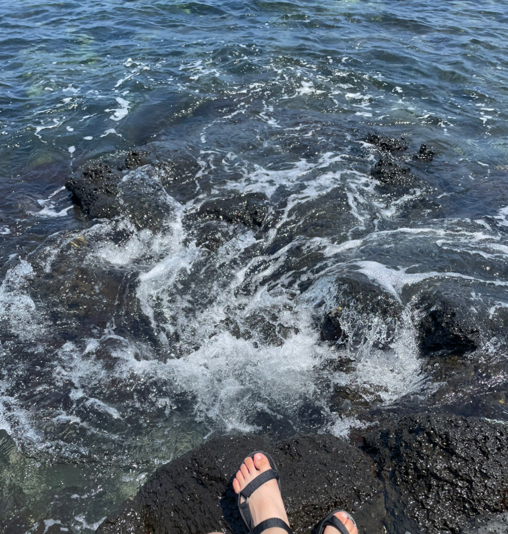 멀리서 들려오는 파도소리 - 정말로 쏴아아... 싸아아아... 한다.-, 검은 현무암, 파란 야생화, 살갗이 타는 뜨거운 햇빛. 바다에 발을 담그지 않을 수가 없었다. 가는 길 앞에 고여있는 물 웅덩이를 밟고 미끄러질 뻔했다. 울퉁불퉁한 현무암 위에 앉아 파도에 발을 담갔다.