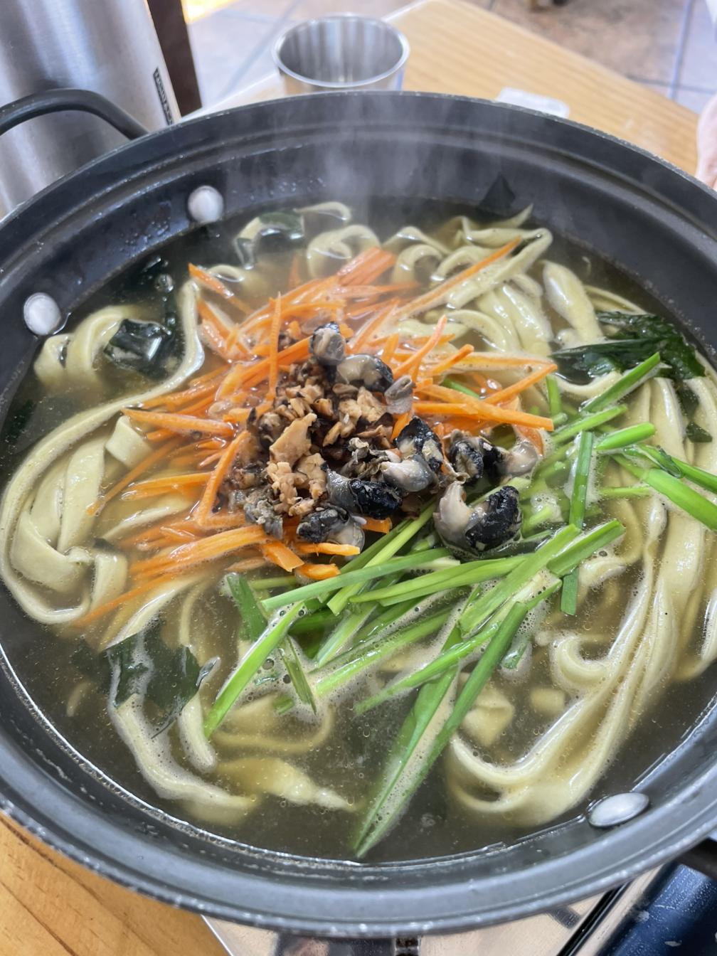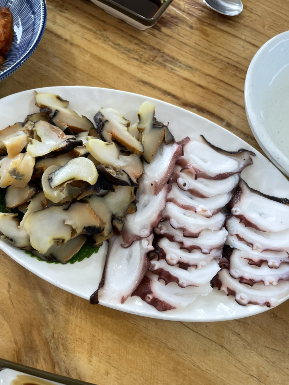 우선 섬을 1/4바퀴 정도 돌았을 무렵, 우리는 식욕을 더 참기 어려워졌다. 점심은 보말칼국수와 문어, 소라 숙회를 먹었다.