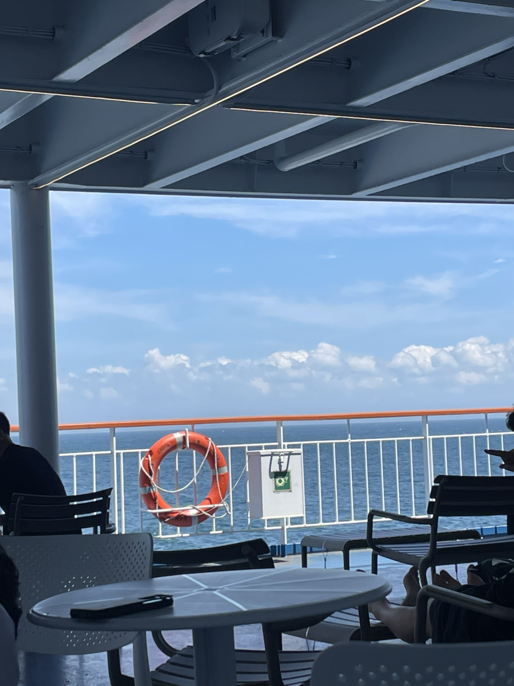 곯아떨어지듯 문간에 대자로 누워있던 장정 셋은 초등학생 어머니와 어린이의 대화 속에 눈을 떴다. 스르륵 일어나더니 밖으로 자리를 뜨는 모습을 보니, 그들은 원래 이 방의 승객이었는지 궁금해졌다. 하지만 궁금해하면 무엇하나. 그들은 또 다른 빈자리 넓은 좌석을 찾아 떠났을지, 아니면 바다의 낭만을 즐기러 갑판으로 갔던지, 그것도 아니면 먹을 것을 구하러 카페에 갔던지, 또 그것도 아니면 1시간에 2만 원 하는 선내 노래방을 즐기러 갔던지 했을 것이다.