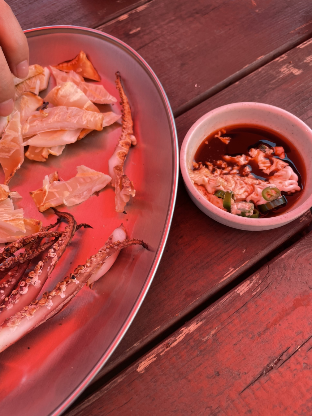 맥반석에 직접 오징어를 구워주셨다. 30도가 넘어가는 더위에도 가게는 반 야외식 노포라 에어컨 없이 운영하고 계셨다. 오징어 한 마리에 15000원. 청양고추와 마요네즈를 넣은 간장소스도 같이 주셨다. 이제까지 육지에서 먹어 본 건조오징어의 비린 냄새가 하나도 없었다. 살이 도톰하니 부드러웠다. 나는 이 더운 날씨에 무슨 오징어야, 생각했었는데 야외 좌석에 앉아 바다를 바라보며 콜라 한잔과 오징어를 뜯고 있자니 평화롭고 좋았다, 물론 땀은 났지만.