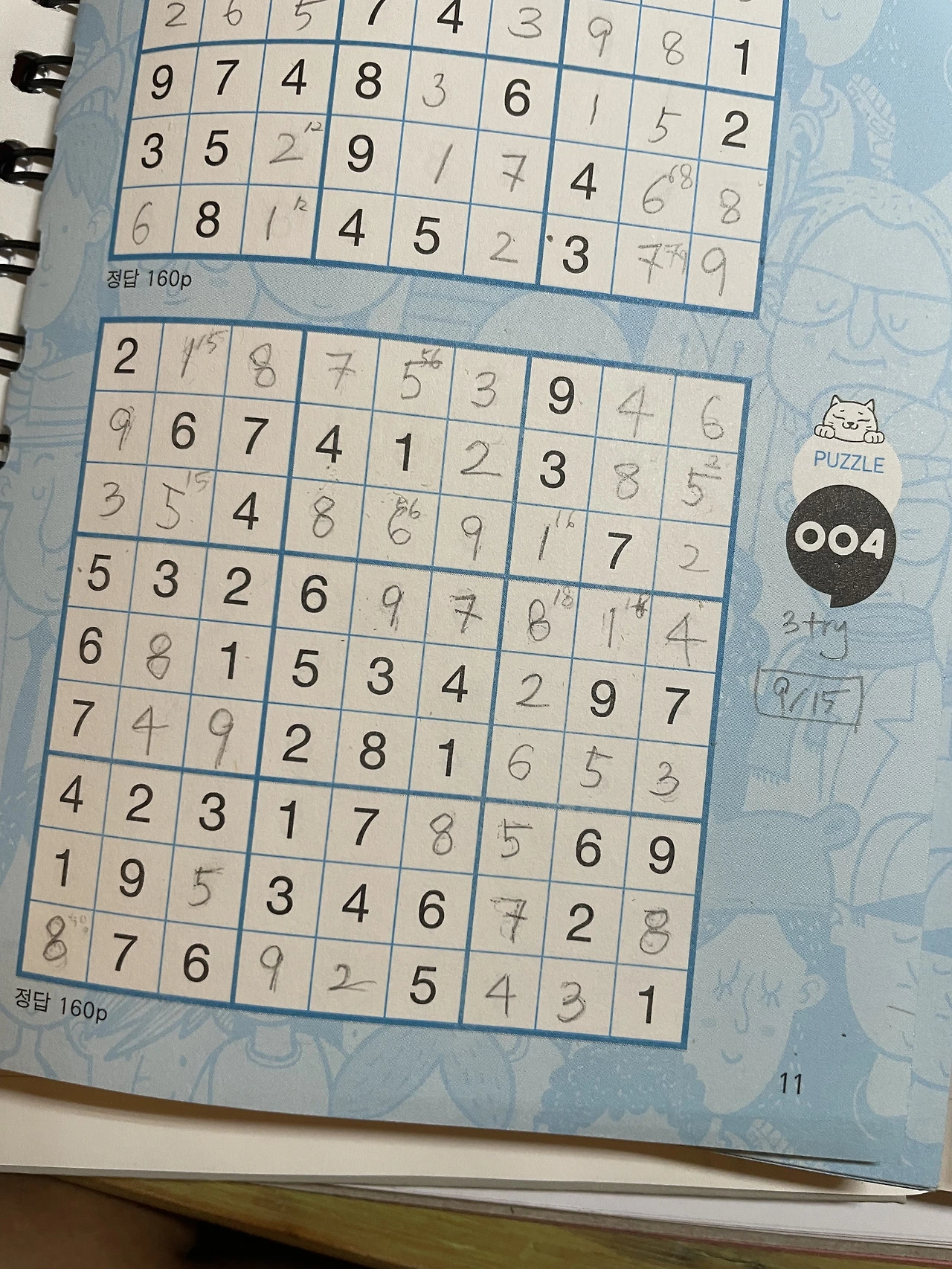 인스타그램을 스크롤하던 시간을 줄이고 스도쿠를 풀거나 듀오링고로 일본어를 배우고 있다. 오늘 스도쿠는 푸는 데에 꽤 시간이 걸렸다. 3번을 지웠다가 4번째에 완성했다. 참고로 스도쿠를 완성하고 그게 정답인지 아닌지는 딱히 확인하지 않고 있다.