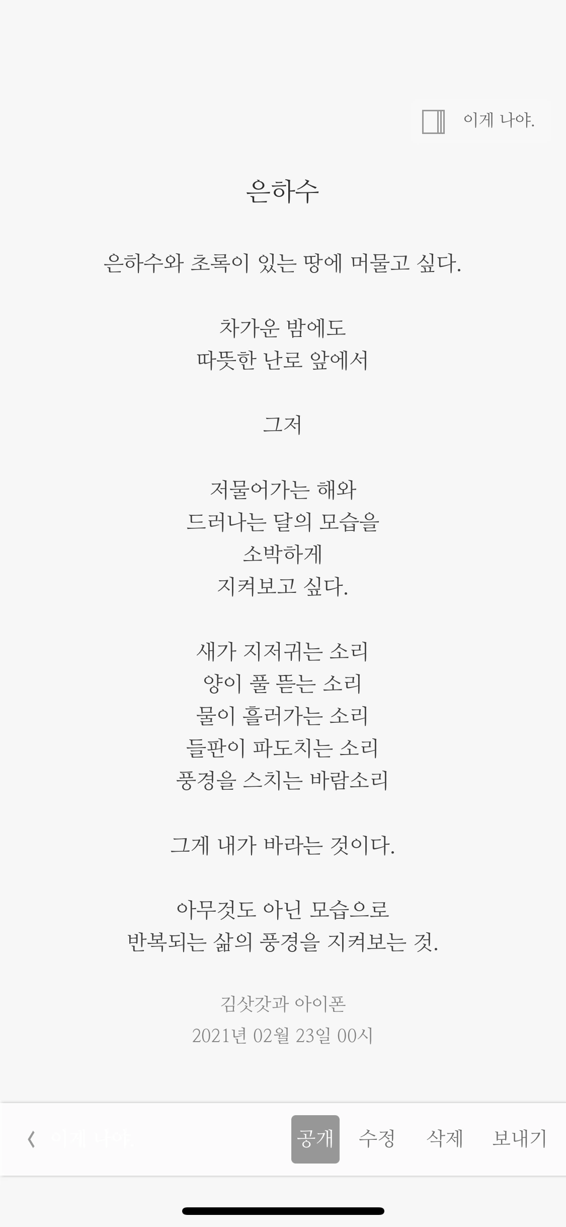 그때부터 나는 이상과 현실의 괴리에 매우 괴롭기 시작했다. 주변의 동기들은 건축에 점점 자신의 길이 생기고, 나아가는 것 같은데 나는 다시 0부터 시작하는 기분이었다. 하지만 그 해파리같던 흐물흐물한 상태의 나는 글을 썼다. 잘 썼는지, 못 썼는지 모르겠지만 숨 쉬듯이 글을 썼다. 그래야 나는 내 가치가 증명되는 것 같았다.