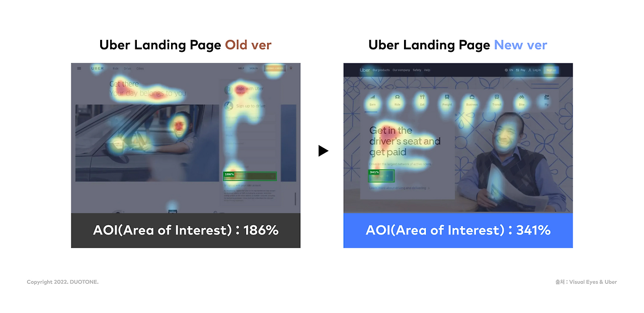 아이트래커의 장점은 우버 사례처럼 실제 디자인에 대한 근거/논리를 만들어 검증 및 설득의 용도로도 사용할 수 있어요. 이것이 저희 듀오톤을 포함하여 UX 디자이너들이 아이트래커를 사용하는 목적이자 이유라고 할 수 있죠.