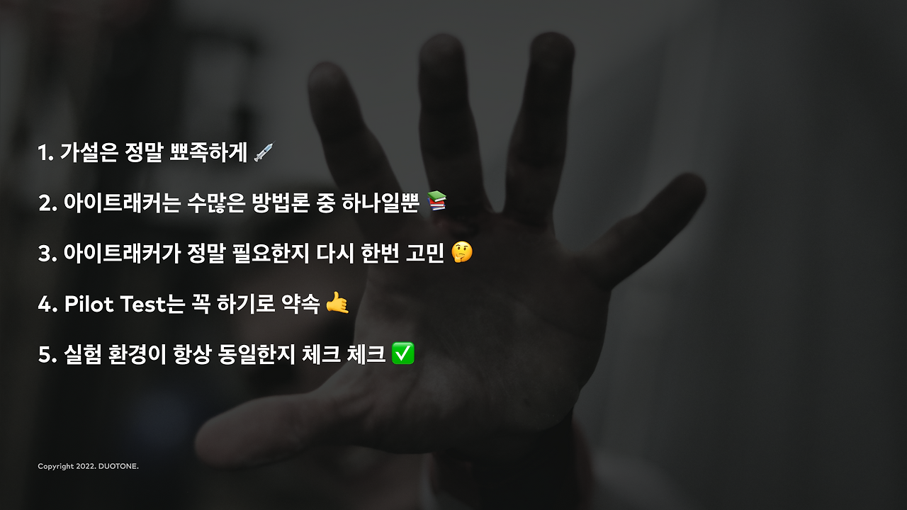끝으로 경험에서 얻은 5가지 꿀팁과 노하우를 전달드리며 마무리하고자 합니다. 앞으로도 듀오톤은 아이트래커에 대해 계속 연구할 것이며 새롭게 얻게 될 인사이트들과 노하우도 잊지않고 공유드릴 수 있도록 노력하겠습니다 :)