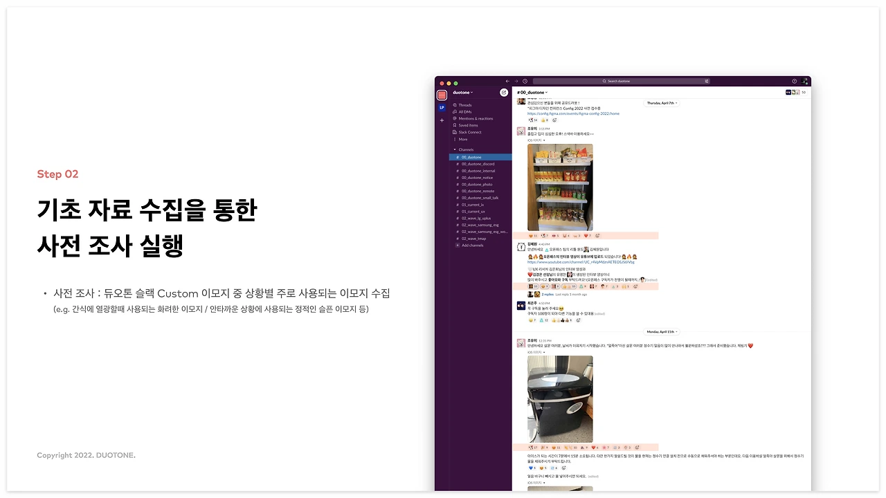 (*여기서 활용한 것은 살몬들이 직접 제작해주신 듀오톤 슬랙 Custom 이모지입니다.)