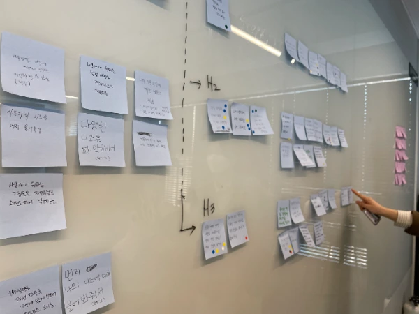 2~3인의 의견 정도는 빠르게 조율할 수 있지만, 다수의 의견을 모아야 할 때는 명확성이 떨어질 수 있어요. 어떻게 하면 시간도 단축하고 모두의 아이디어도 최대한 살려낼 수 있을까 고민을 많이 해봤는데요. 여기서도 분류가 도움이 돼요. 먼저 전체 의견을 취합한 뒤, 공통된 의견을 뽑아내고 나머지는 유사성에 따라 분류해요. 공통적으로 모아진 의견을 최우선적으로 수렴하며, 나머지 의견들은 우선순위에 따라 반영하거나 필요에 따라 결합, 추가 디벨롭, 베리에이션 하여 사용하기도 합니다.