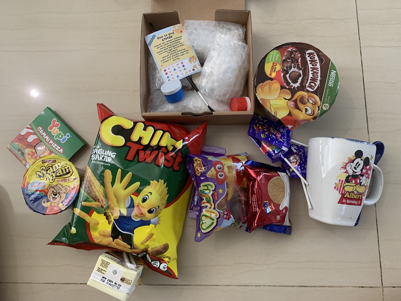 물감색칠키트, 우리가 거의 사주지 않는 과자와 사탕, 멸균초코우유, 젤리, 그리고 아이 이름이 들어간 머그잔. 그 덕분에 우리 집 찬장에는 "XX가 N살이 되었어요!"라고 외치는 머그잔이 네 잔. 아니 이번 것까지 하면 총 다섯 잔이다. 물감색칠을 좋아하는 우리 아이는 덕분에 오후 한 시간을 물감 색칠을 하며 보냈고 오후 간식 시간에는 구디백에서 나온 과자 중 하나를 골라 먹었다.