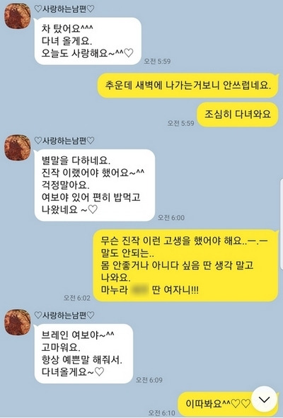 착한 남편이 미안해하지 않게 아침형 인간이 되어야겠다 생각하던 중 선물 같은 남편의 메시지를 받았습니다.