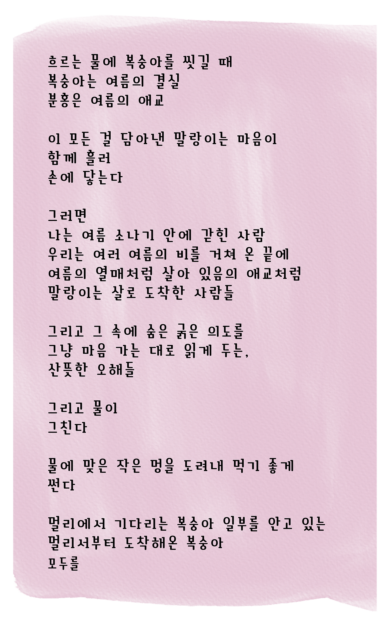 손유미의 시는 잘 익은 복숭아 하나를 건네며 다정하게 묻습니다. 흐르는 물에 씻겨 내 손에 닿는 말랑이는 마음. 우리는 그 부드러움에 안도하지만, 이내 그 속에 숨은 단단한 씨앗, 즉 굵은 의도를 궁금해합니다.