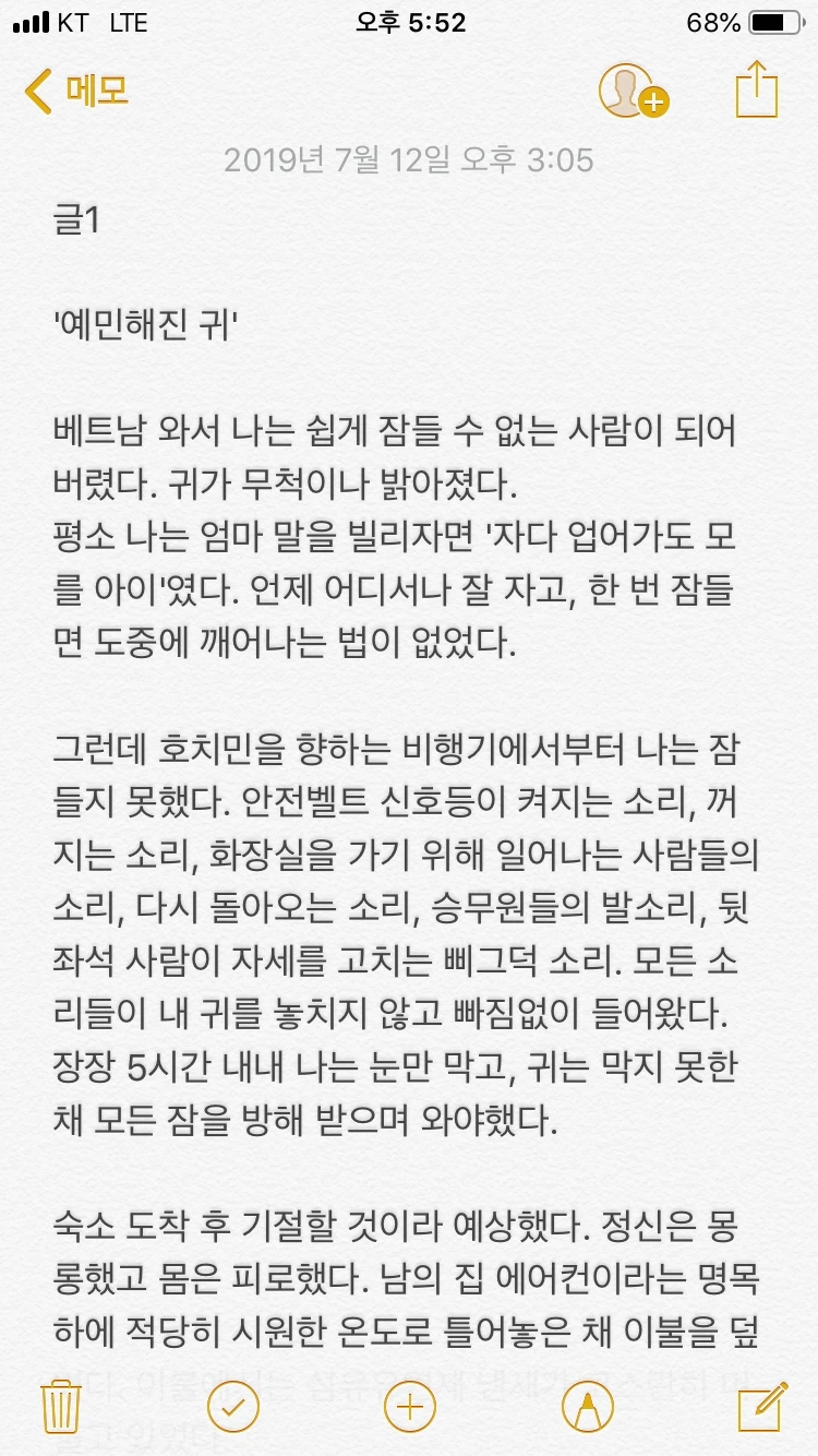 귀가 무척이나 밝아졌다. 그 덕분에 한국의 땅을 날아오르는 순간부터 쉽게 잠들 수 없는 사람이 되어 버렸다.