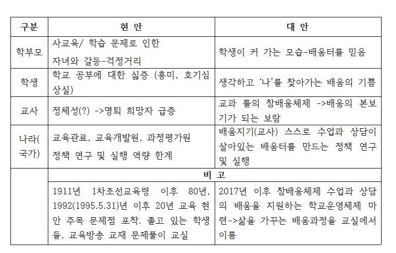 그래서 이제 학생들에겐 스스로 묻고 함께 답을 찾아가는 ‘배움’의 처지에서 ‘배움’ 당사자 틀(구조)로 접근하는 대안이 필요합니다.