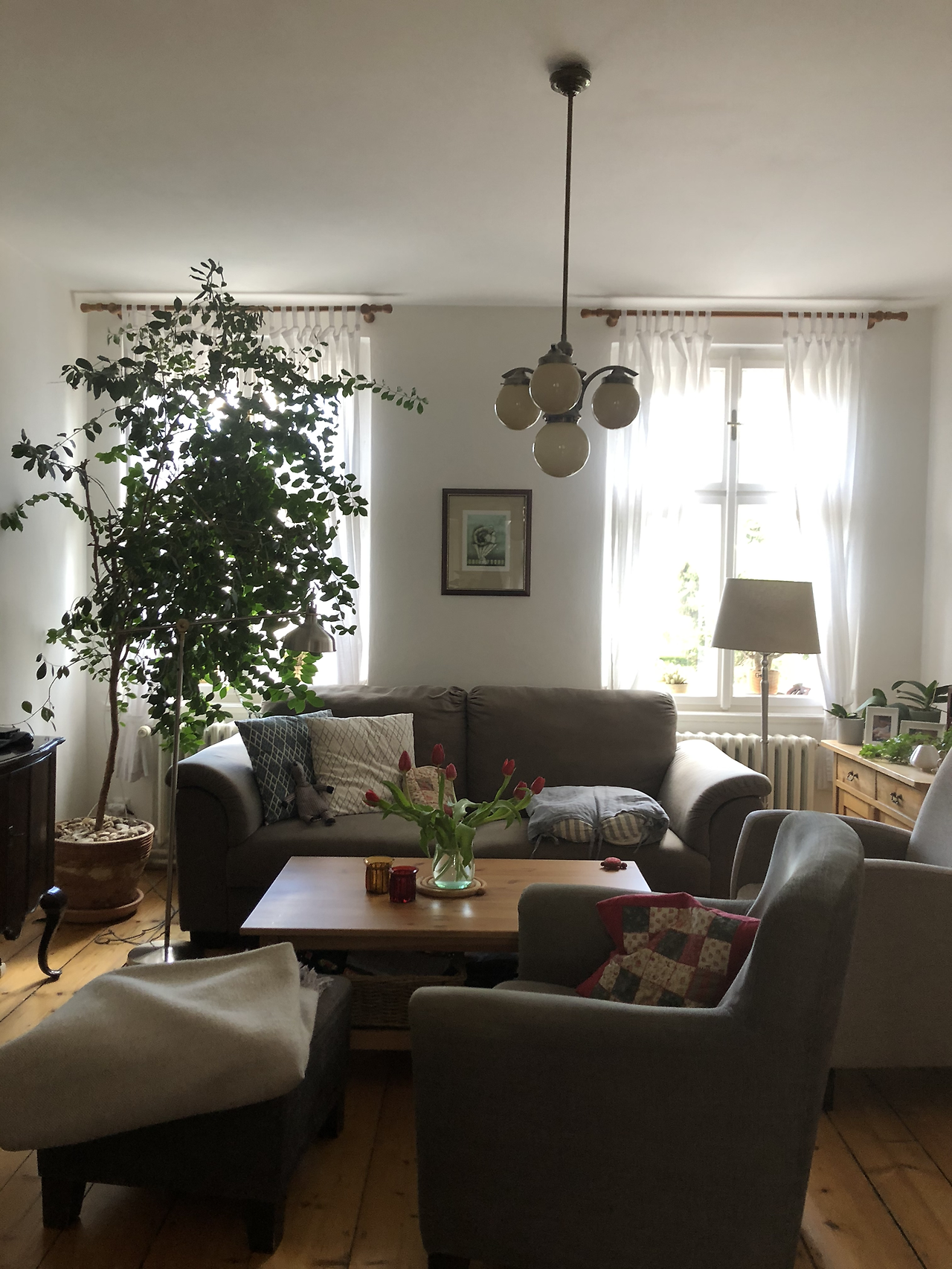 그중에서도 내가 사진으로 남길 만큼 예쁜 장소가 있었는데, 이 곳은 소파와 티브이가 있는 중앙 거실이었다. 중앙에 놓인 탁자 위에는 튤립이 꽂인 화병이 놓여 있었고 그 밑을 포근해 보이는 카페가 덮고 있었다. 하얀 커튼이며 밑으로 내려온 조명이며 옆에 세워진 큰 화분까지 모든 것이 완벽해서 이 곳에서는 소파에 앉아있는 것만으로도 기분이 좋았다.