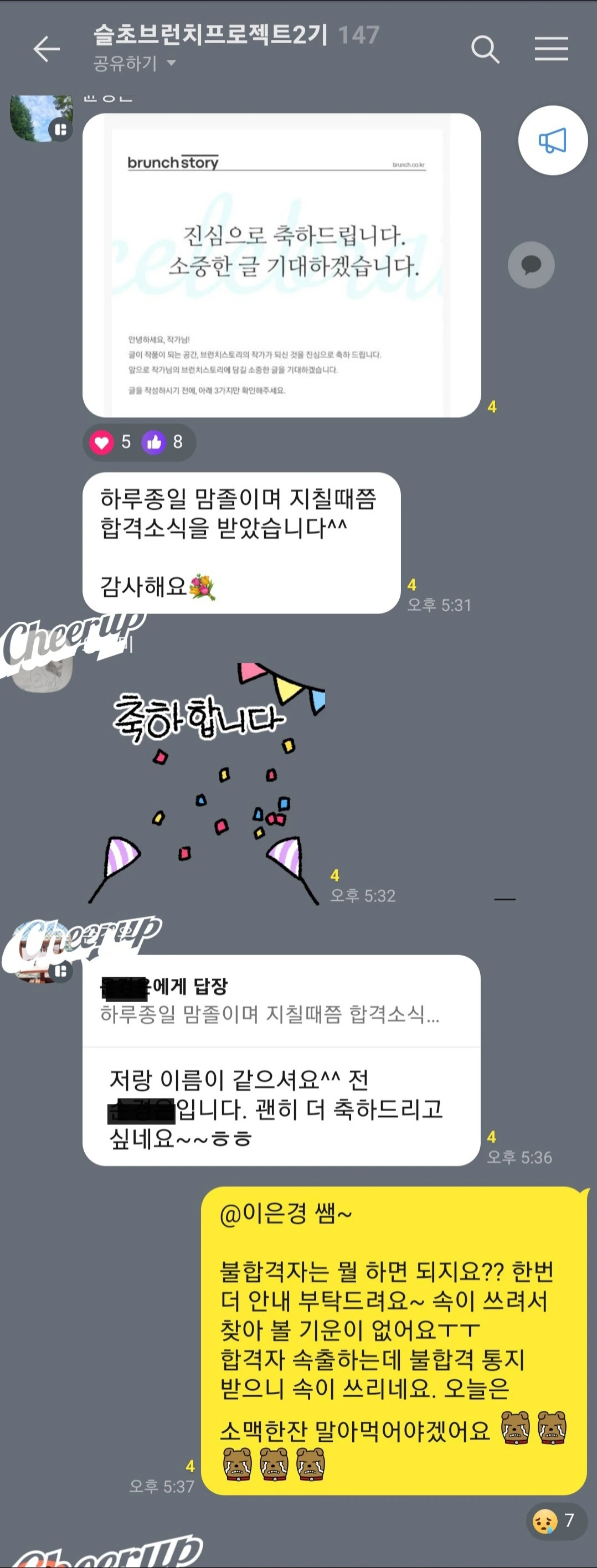 140여 명이 있는 오픈단톡방에 나의 분통함을 그대로 올린 순 없다. 속출하는 합격자와 축하가 어우러진 축제의 분위기 속에 찬물을 끼얹는 말아야겠다 생각하니 나 자신이 더 초라하다. 비통한 마음을 안고 한쪽 구석에 글을 올렸다.