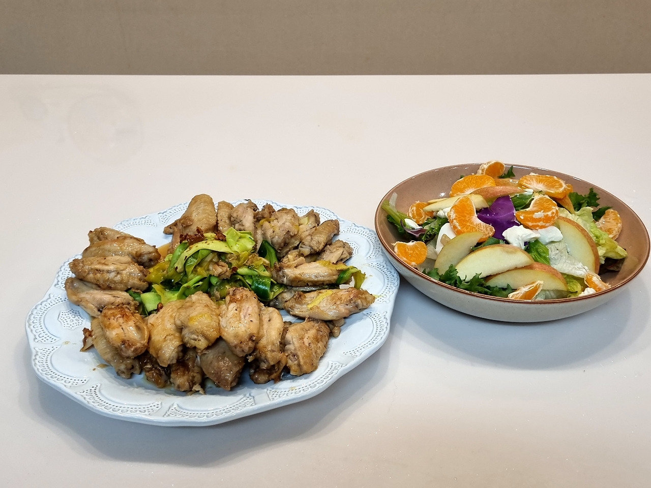 7시가 넘은 시간 배고프다며 성화를 부리는 아이들을 온몸으로 막아가며 사진을 찍어댄다. 급하게 후추도 갈갈갈 뿌려 넣고 페페론치노도 빠른 손으로 뿌셔 올린다. 사진은 이만하면 건져낸 것 같다. 사진 건졌으니 귤도 더 듬뿍 올리고 사과도 산처럼 쌓아서 올린다. 잘못 먹으면 엄청 매운 페페론치노는 아이들이 손 못 대게 내 앞으로 옮겨놓는다. 자 시식 시작~! 음~ 맛있다. 느끼하지 않으면서도 쫄깃한 닭날개~ 은은한 단맛의 짭쫄한 양념. 설탕, 소금, 간장, 물, 마늘 만으로 그 촉박한 시간에 이 맛을 구현해 내다니 난 정말 요천이다.
