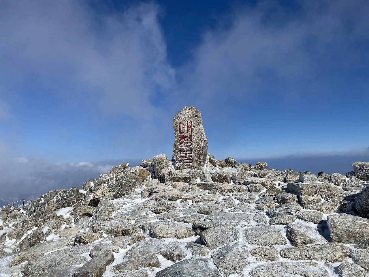 정상에서 마주한 대청봉 정상석은 위엄이 있었다. 올라 오면서 많은 사람들이 강풍을 조심하라고 한다. 역시나 둘러싼 산맥들에서 세찬 바람이 휘몰아쳤다. 몸을 가누기도 어려워 정상석에 접근하려고 하니 무서웠다. 몸을 낮춰 가까이 접근할 수 밖에 없었다. 정상에 올라 주변 경치를 감상하고, 야호!를 외치려고 했으나, 그 계획은 강풍 앞에 깨졌다. 근처 중청 대피소로 급하게 뛰어 내려가는데도 강한 바람이 몸을 휘청거리게 했다.