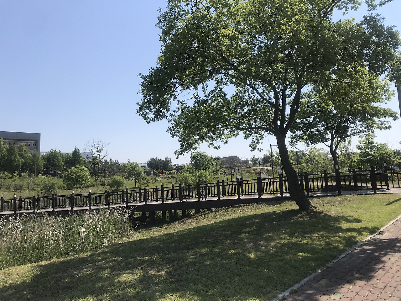 동네 공원은 요즘 트렌드에 맞게 인공 호수와 가로수들이 줄지어 서있고, 주말엔 화려한 음악분수 쇼가 펼쳐지고, 무대 위에선 버스킹 공연이 있으면 둘씩 손잡고 앉아 구경을 하며 박수를 치며 흥을 돋운다. 역시 쾌적한 신도시에서 살길 잘한 것 같다는 생각이 지배적으로 다가온다. 대출이자에 대한 심적 고통은 이럴 때 사라진다. 여린 나뭇잎들이 한 뼘씩 삐죽거리며 올라오지만 신도시라 그런지 아직은 큰 나무들이 많지않다. 오늘은 지니 말처럼 자외선 지수가 높아 선글라스에 모자, 게다가 양산까지 한 손에 들고 나왔다. 한 손엔 강아지를 끌고, 그 모양이 꽤나 우스꽝스러운지 운동 나오신 분들의 시선을 금세 사로잡는다.