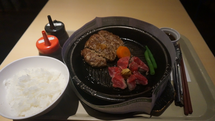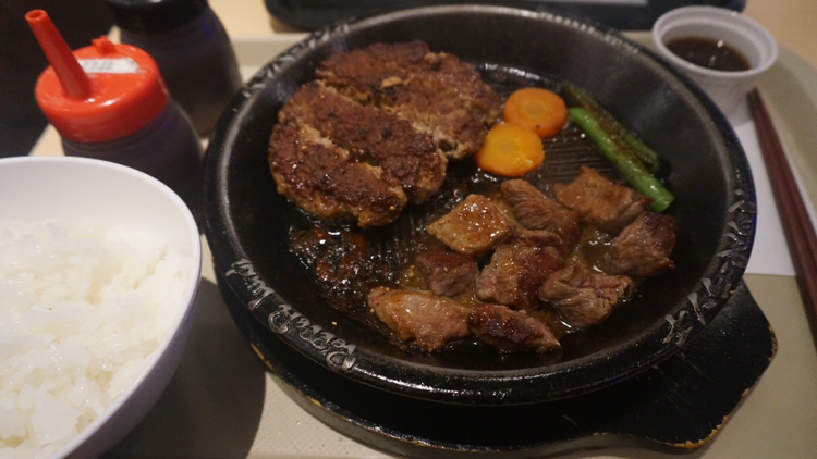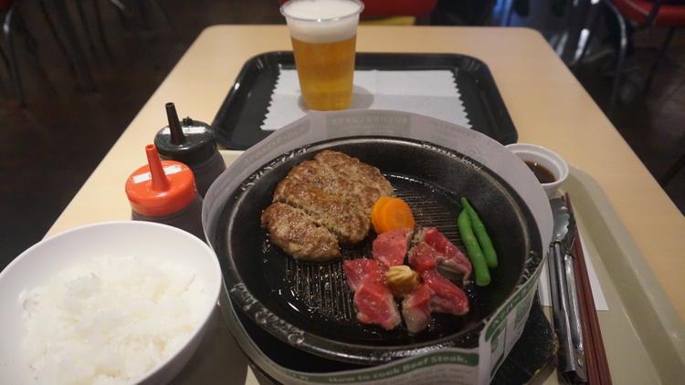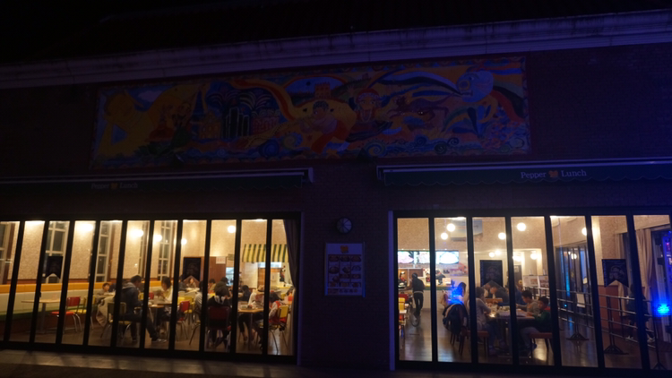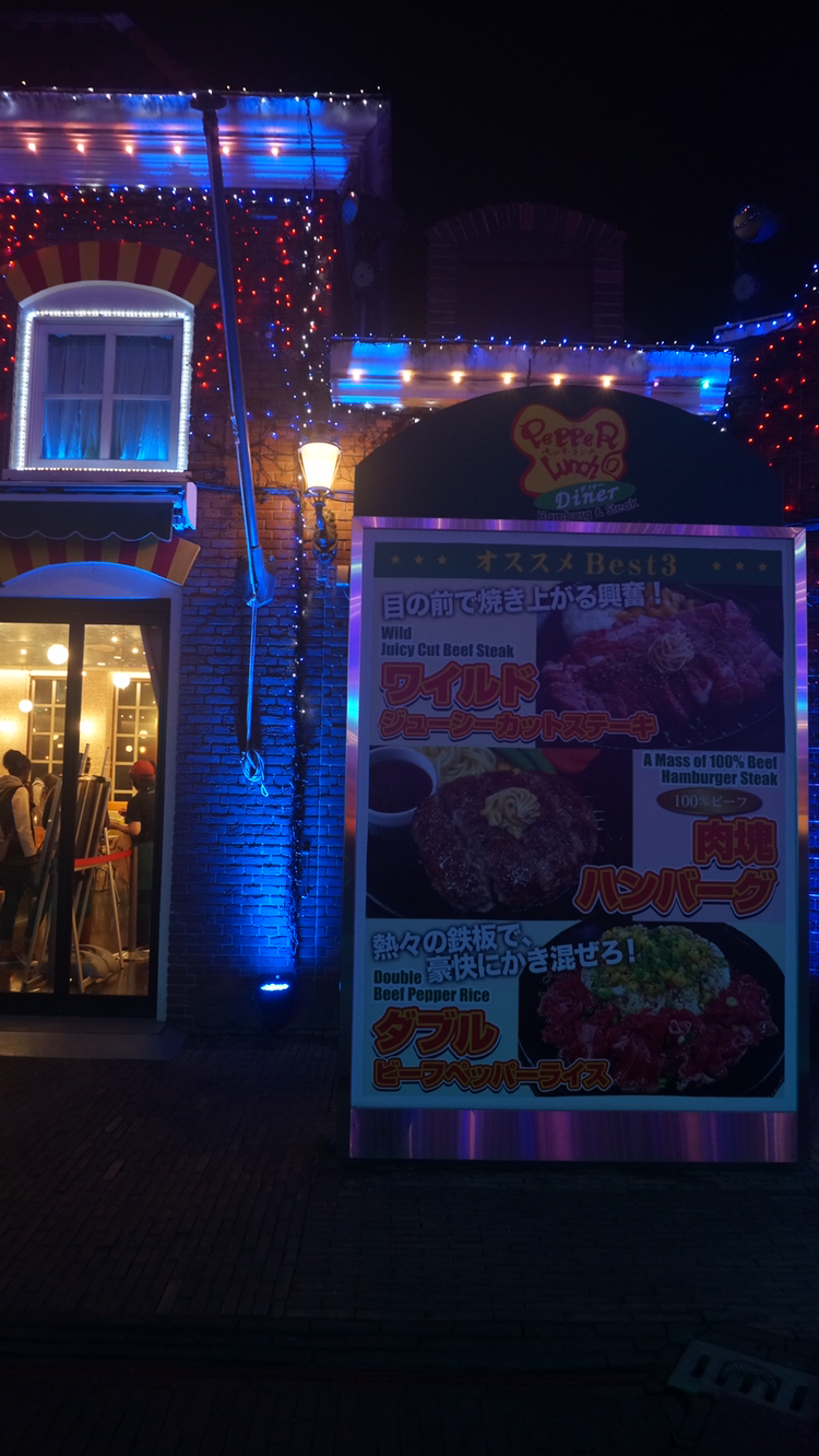 오늘도 먹는 둥 마는 둥 급하게 서둘러 먹은 호텔 조식이 먹은 음식의 전체이니 서둘러 더 허기지기 전에 저녁을 먹어야겠다 싶어 주변을 살피던 중 일루미네이션 쇼가 펼쳐지는 건물에 햄버거 스테이크 파는 곳이 있어 무작정 들어갔다!