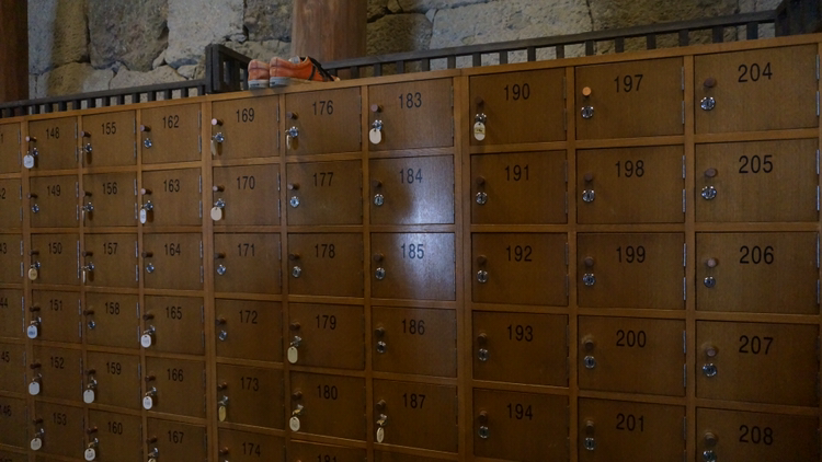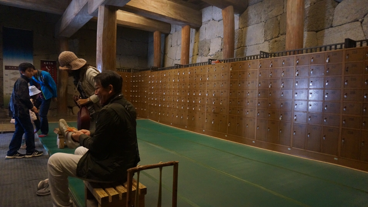 천수각은 입장하면 신발은 번호표 열쇠가 있는 락커에 넣어둔 다음 잠그고 실내화로 갈아 신고 계단을 올라가는 것부터 관람이 시작된다!