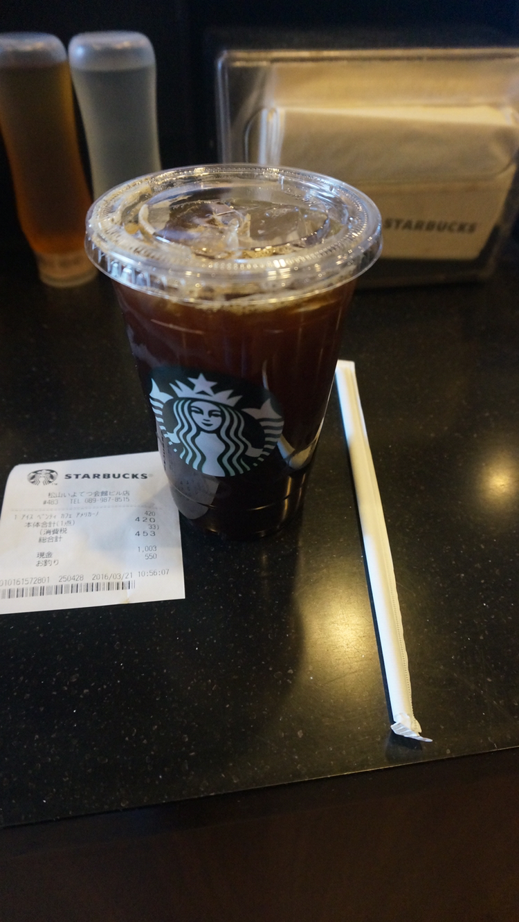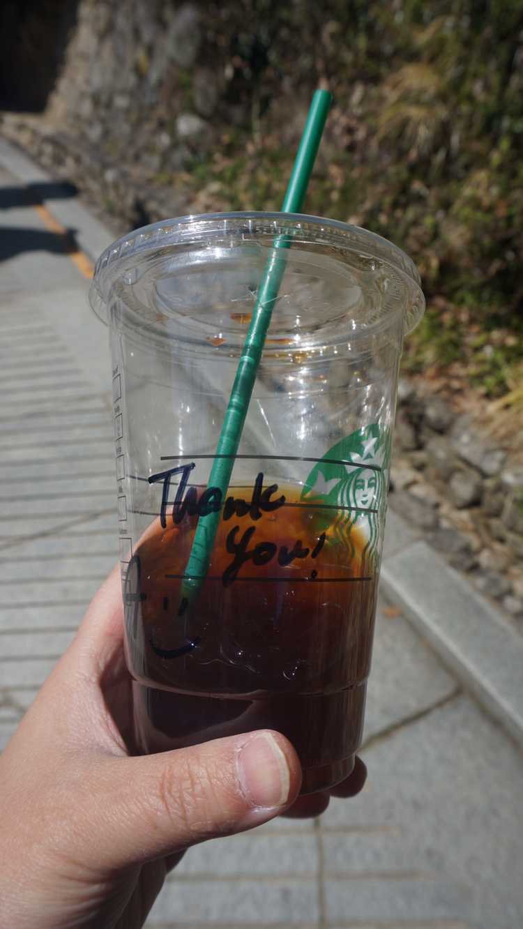 160엔 아끼겠다고 걸어와서는 코인락커에 100엔 쓰고 아침 사치에 커피를 더하려 아이스 아메리카노 벤티 사이즈를 500엔 가까이 써서 테이크아웃!