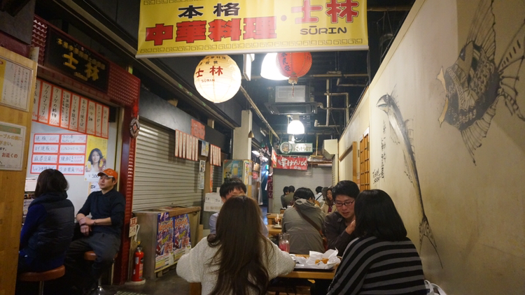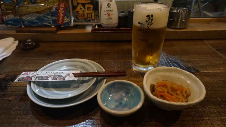 자리 잡은 곳 앞에 있는 식당에서 나마비루 (생맥주) 하나를 500엔에 구매한 다음 본격적인 저녁 식사 시작!