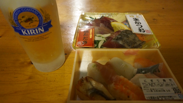 이미 많은 사람들이 자리를 차지한지라 몇 바퀴를 더 돌고 돌아 겨우 자리를 잡고 미리 구매한 모둠 초밥이랑 이곳에서 유명하다는 가쓰오 타다키를 꺼냈다!