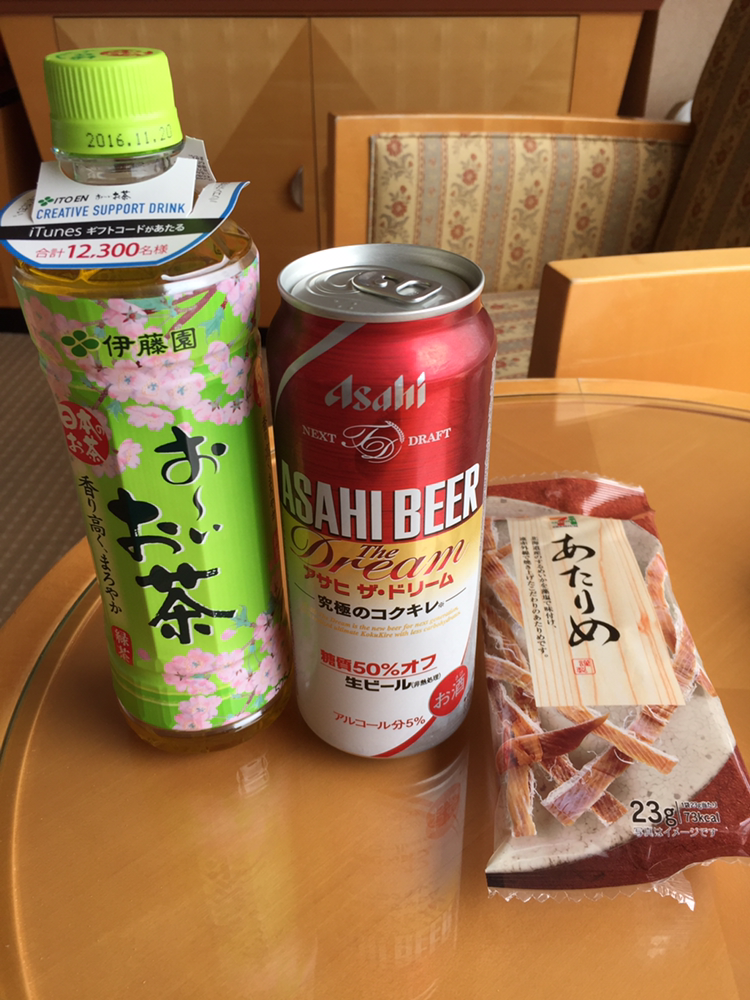 든든하게 배를 채우고 주변을 좀 더 둘러보다가 늦은 저녁이 되니 너무 한적 해지는 것 같아 역 앞에 편의점에 들러 맥주랑 올리브 아이스크림, 슈크림 아이스크림을 사서 객실로 올라온 다음 호텔에서 제공하는 옷으로 갈아입고 경건한 마음으로 아이스크림을 흡입했다!
