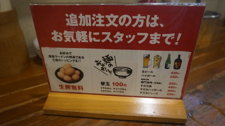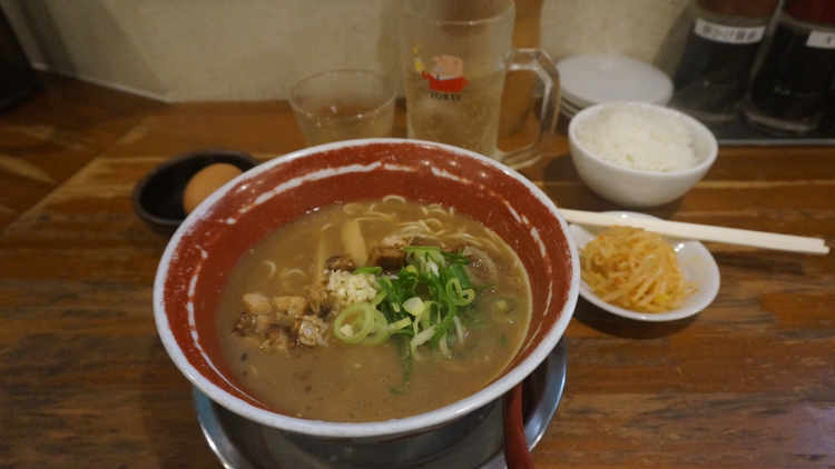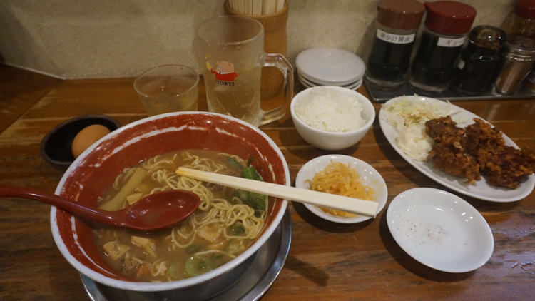 특제 마늘 소스 라멘에 혼합주랑 밥, 날달걀은 무료, 거기에 닭튀김까지 풍성하게 시켜 와구와구 먹었다!