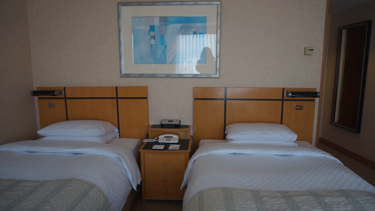 그 옆 서랍 안에는 객실에서 입을 수 있는 옷이 마련되어 있고 침대 사이에는 객실 내에서 쓸 수 있은 전화기가 있다!