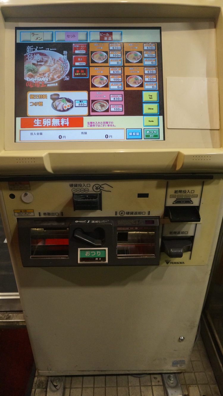가게 앞에 메뉴를 고를 수 있는 기계가 있는데 한국말이 지원되긴 하는데 돈을 먼저 넣어야 하는지 모르고 한참을 헤매서 겨우 원하는 메뉴들을 선택한 다음 일본 남자의 도움으로 잔돈을 돌려받은 다음 가게 안으로 들어갔다!
