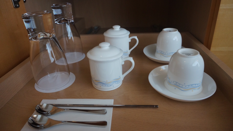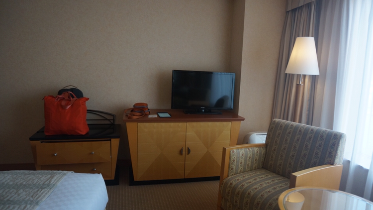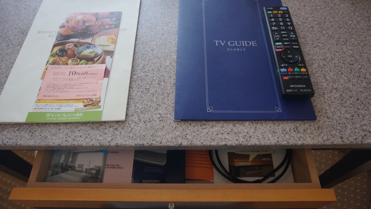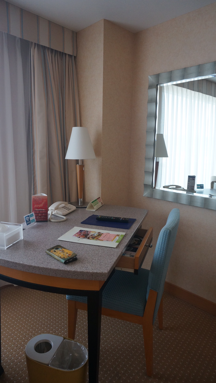 책상에는 호텔 안내 책자가 놓여 있고 TV 테이블 아래에는 찻잔이랑 미니바가 있다!