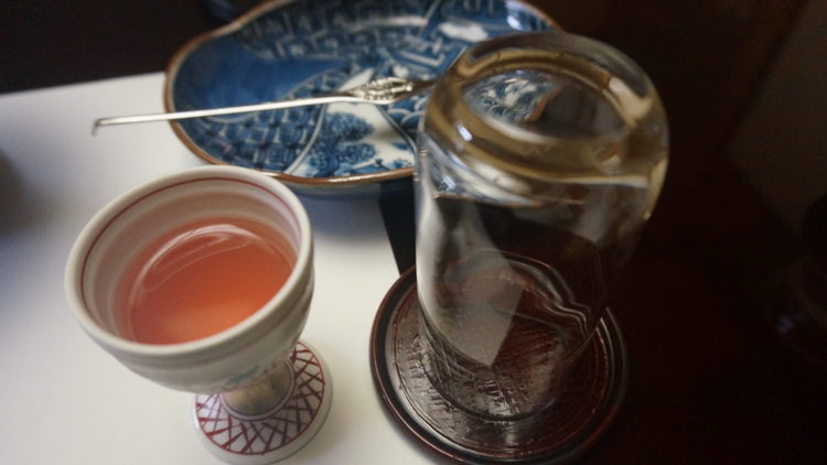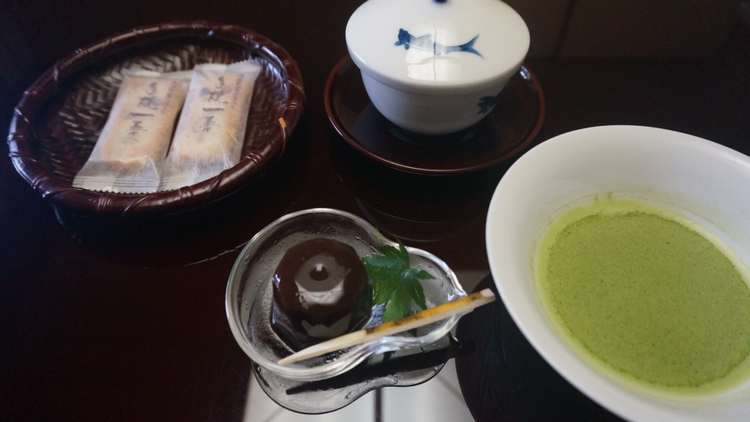 조금 기다리니 웰컴티로 녹차랑 말차 그리고 쌀 과자, 팥 앙금이 들어있는 간식을 들고 왔다!