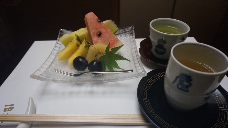 마지막으로 입가심용 차랑 녹차, 그리고 후식으로 과일을 먹으면 저녁 식사 끝!